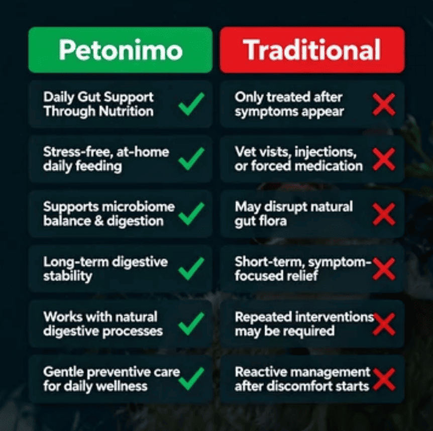 Traditional digestive care often relies on veterinary visits, injections, or medications once symptoms appear. While sometimes necessary, these approaches can be stressful for pets, may disrupt natural gut balance, and often focus on short-term relief rather than long-term digestive stability.