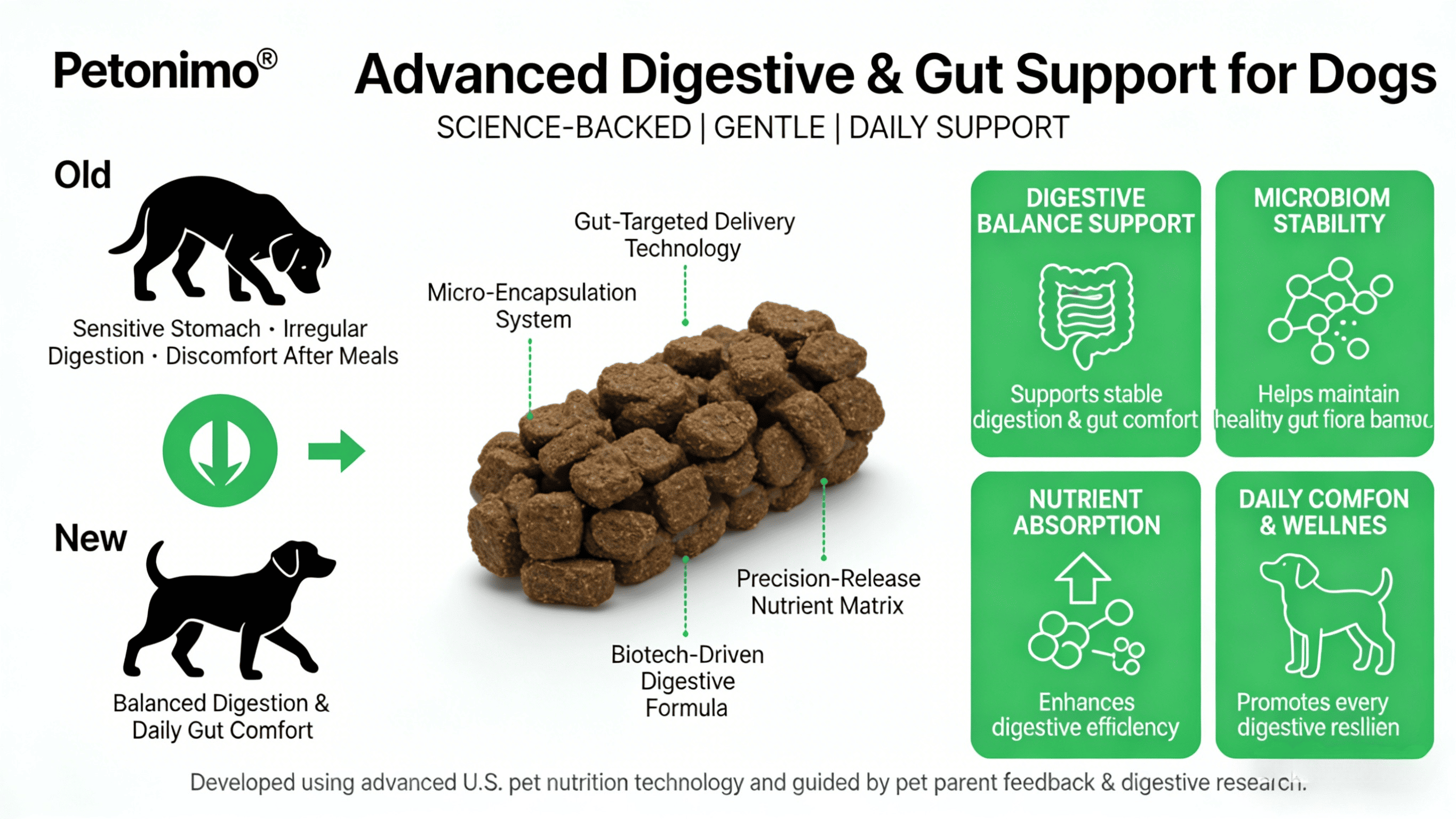 Petonimo is lab-engineered in the USA using next-generation pet biotechnology and gastrointestinal research platforms. Our formula is developed through micro-encapsulation technology, gut-targeted delivery systems, and precision-release nutrient matrices, designed to support digestive efficiency, microbial balance, and immune stability in dogs.